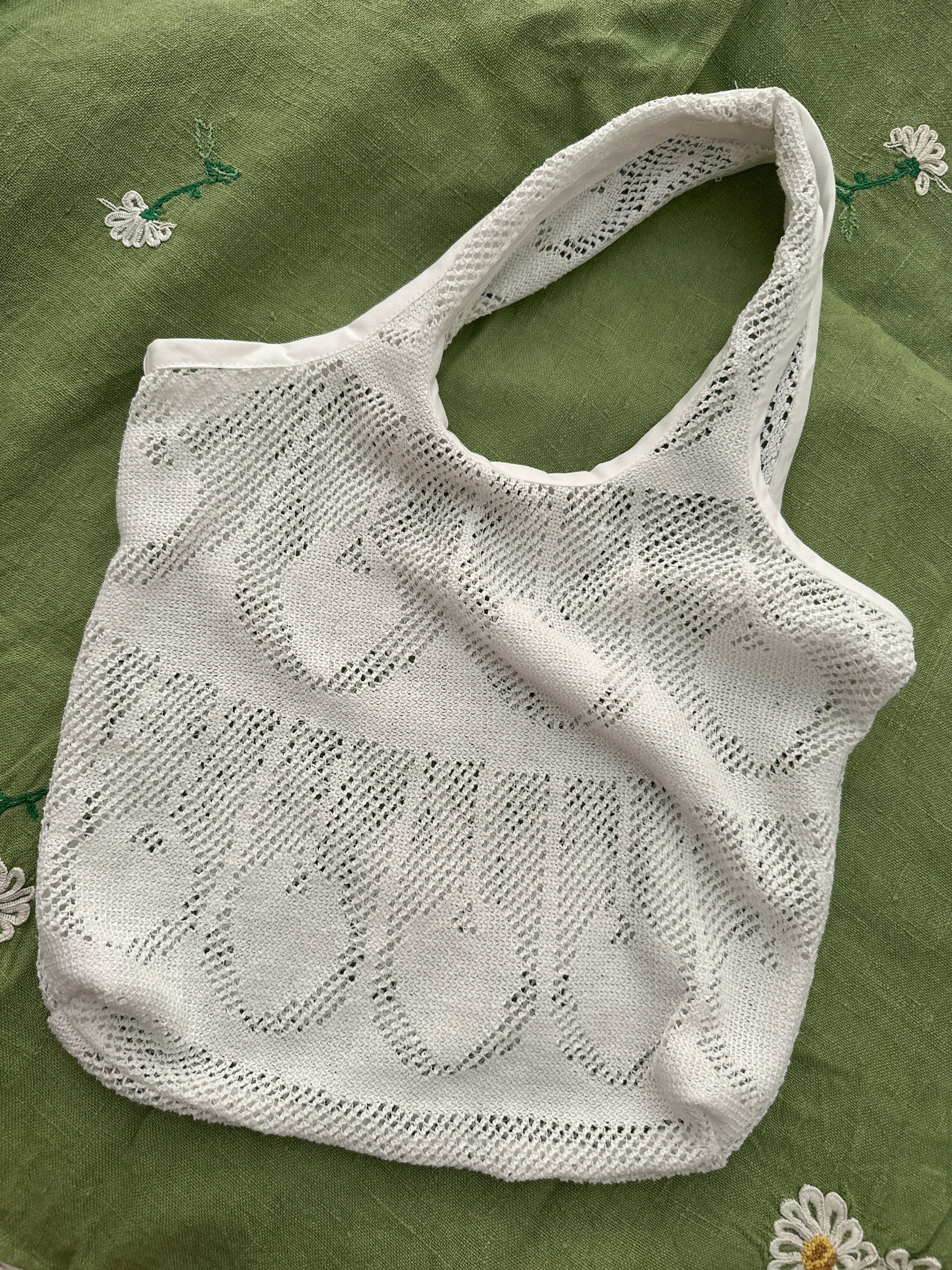 Bolso confeccionado a partir de un mantel vintage de los años 70, con calado tipo lace filet, que nos transporta a casa de nuestras abuelas, donde lo cotidiano era también bello.