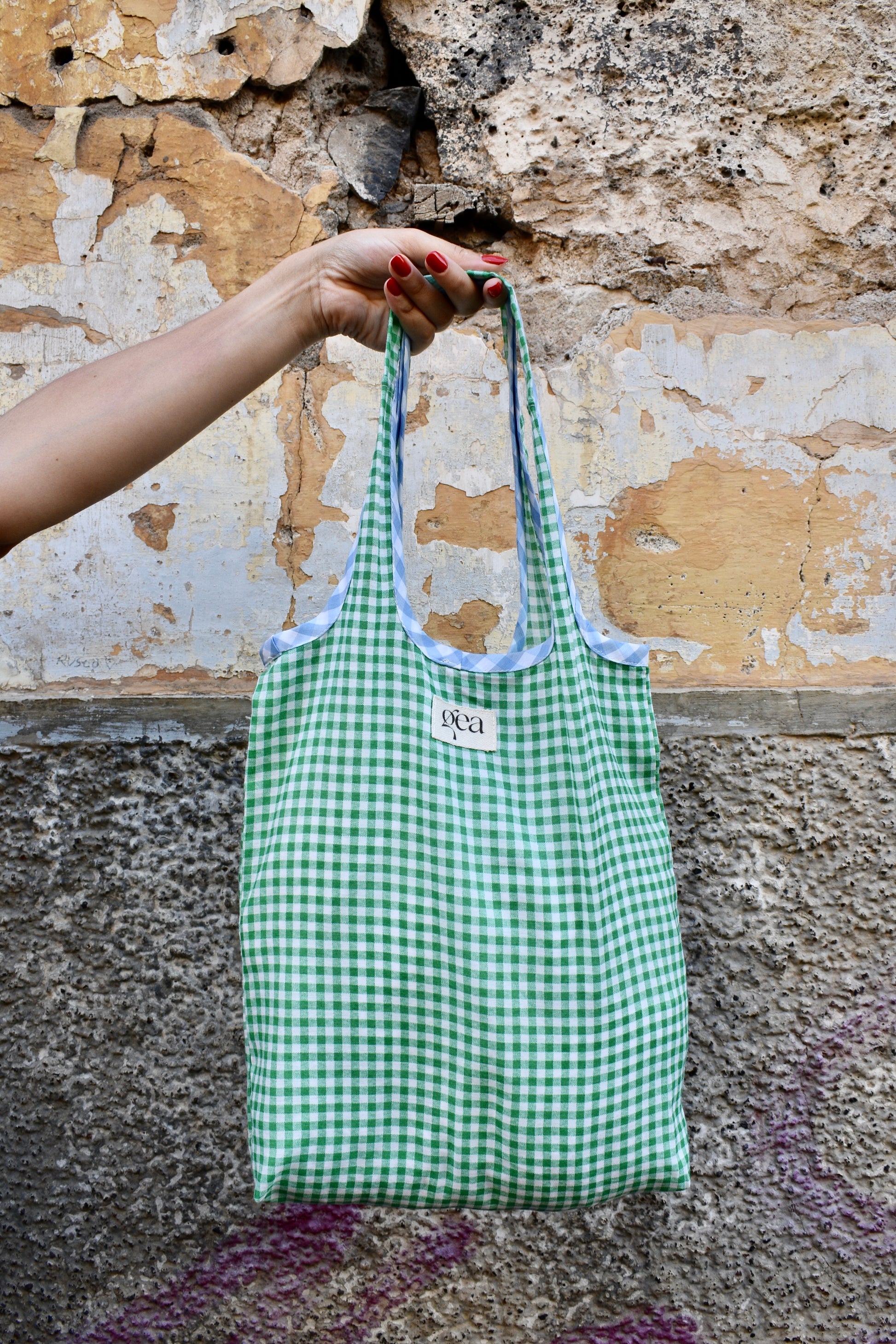 Cada Talega GEA es única, confeccionada a partir de textiles recuperados. Esta pieza en concreto nació de una antigua cortina: un tejido con historia que hoy vuelve a caminar el mundo, convertido en un objeto útil, bello y con propósito.